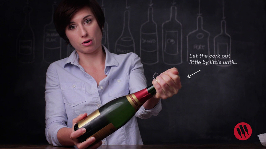 Đầu tiên cắt bỏ phần vỏ bọc quanh nút chai để có thể tháo gỡ dây kẽm ràng buộc nút. Bạn muốn mở tạo tiếng kiêu lớn mà rượu không bắn ra ngoài? Bạn nên cầm chai nghiêng đi chừng 45%. Nhớ cẩn thận hướng nút chai về phía không có người ngồi và không đồ vật gì dễ vỡ. Kế đó tháo vòng dây kẽm bao quanh nút chai rồi dùng tay trái nắm chặt lấy nút. Trong khi tay phải từ từ xoay thân chai để giúp nó tách rời khỏi nút. Áp lực trong chai sẽ khiến nút bật tung ra. Muốn cho tiếng kêu vừa phải, cũng làm như vậy. Nhưng khi nút chai bắt đầu được đẩy lên thì vừa xoáy nút vừa nhúc nhích một chút. Để áp lực xì bớt ra đồng thời giữ nút lại để giảm bớt sức bật của nó.