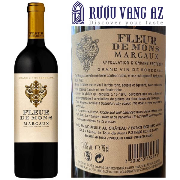 Rượu được làm nên từ ba loại nho là Cabernet Sauvignon, Merlot và Petit Verdot trồng tại vùng Bordeaux. Vùng này nổi tiếng với các dòng rượu vang được làm nên từ nhiều giống nho. Vì vậy rượu vùng Bordeaux luôn mang hương vị phức hợp với những nét đặc trưng riêng. Nhà làm rượu Fleur De Mons đã tính toán công thức rất kĩ để tạo nên chai vang hảo hạng.