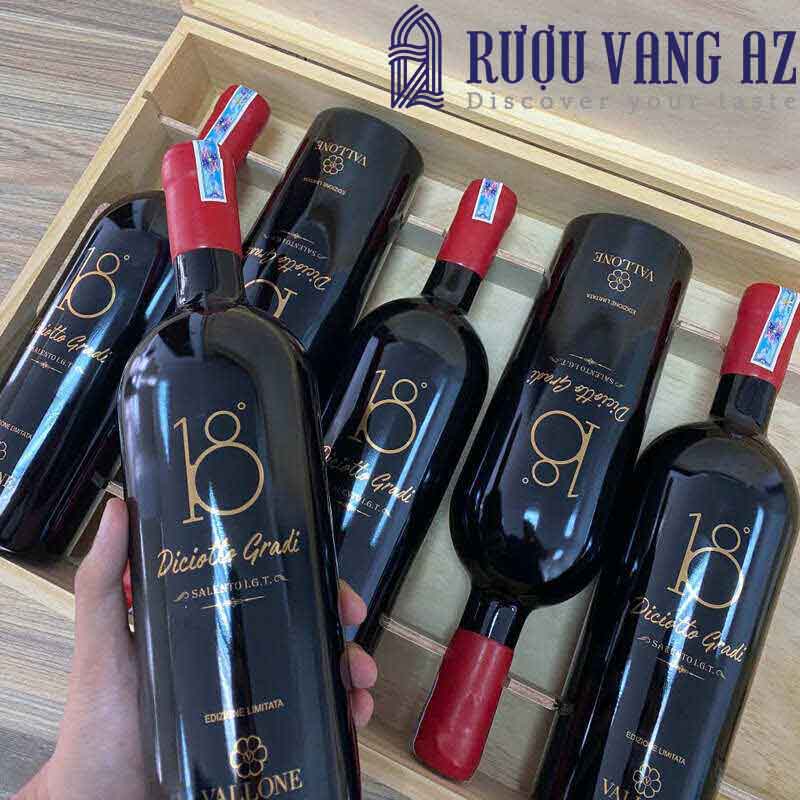 Rượu Vang Ý Diciotto Gradi 18 Độ là chai vang cao cấp mang thương hiệu Vallone của Ý. Với ngoại hình được thiết kế sang trọng cùng nhãn mác sắc nét thu hút ánh nhìn. Ẩn sâu bên trong là hương vị phức hợp cùng sắc màu độc đáo chinh phục khẩu vị mọi thực khách. Rượu trở thành thức uống chính trong nhiều bữa tiệc hay làm quà biếu dịp lễ tết. Hiện nay, rượu có mặt ở hầu hết các quốc gia trên thế giới. Với doanh số bán ra hàng năm đáng ngưỡng mộ và mang về tiếng tăm lừng lẫy cho nhà sản xuất.