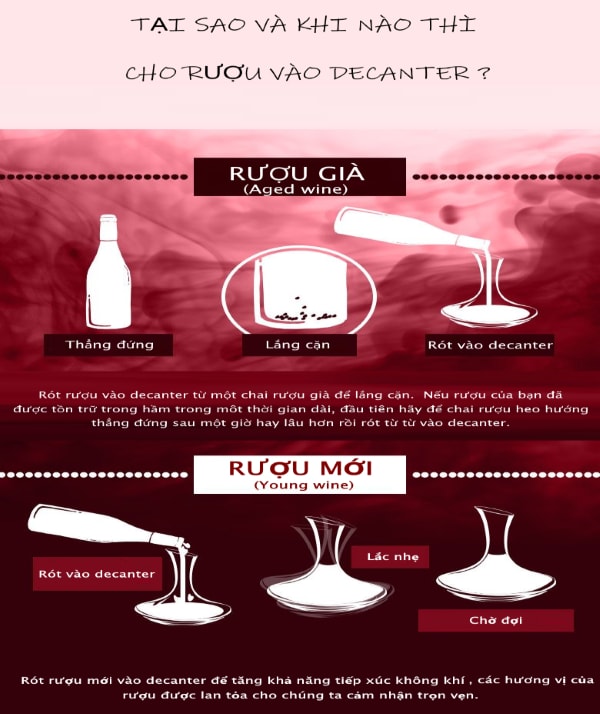 - Decanter giúp rượu mới thở nhanh hơn. Với những chai rượu còn trẻ, tuy không cần phải lọc cặn nhưng để oxygen tác động vào rượu nhanh hơn. Làm cho rượu tỏa hương thơm, tăng mùi vị và giảm bớt tannin. Rượu trẻ cũng không cần rót nhẹ tay từ tốn như khi rót rượu già. Trái lại, nên rót mạnh tay cho bọt sủi lên thì oxygen lại càng xâm nhập vào chất rượu mau hơn.