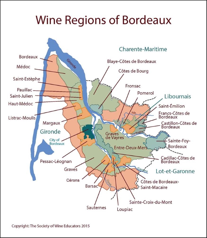 Bản đồ cho thấy toàn bộ khu vực trồng nho làm rượu bao quang thành phố Bordeaux. Điểm nhấn là 2 con sông chính là Garonne và Dordogne nhập vào nhau ở nơi đây. Tạo thành một dòng hợp lưu rộng lớn là sông Gironde chảy ra biển. Căn cứ vào dòng sông đó, ta có thể định vị các khu vực làm rượu quan trọng.